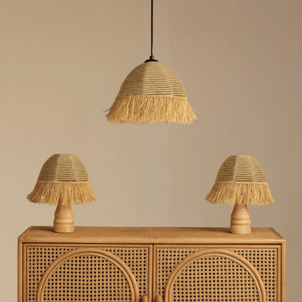 -%100 Doğal Rafya ip ve Jüt Halat ip kullanılarak tamamen el işçiliği ile üretilmiştir.